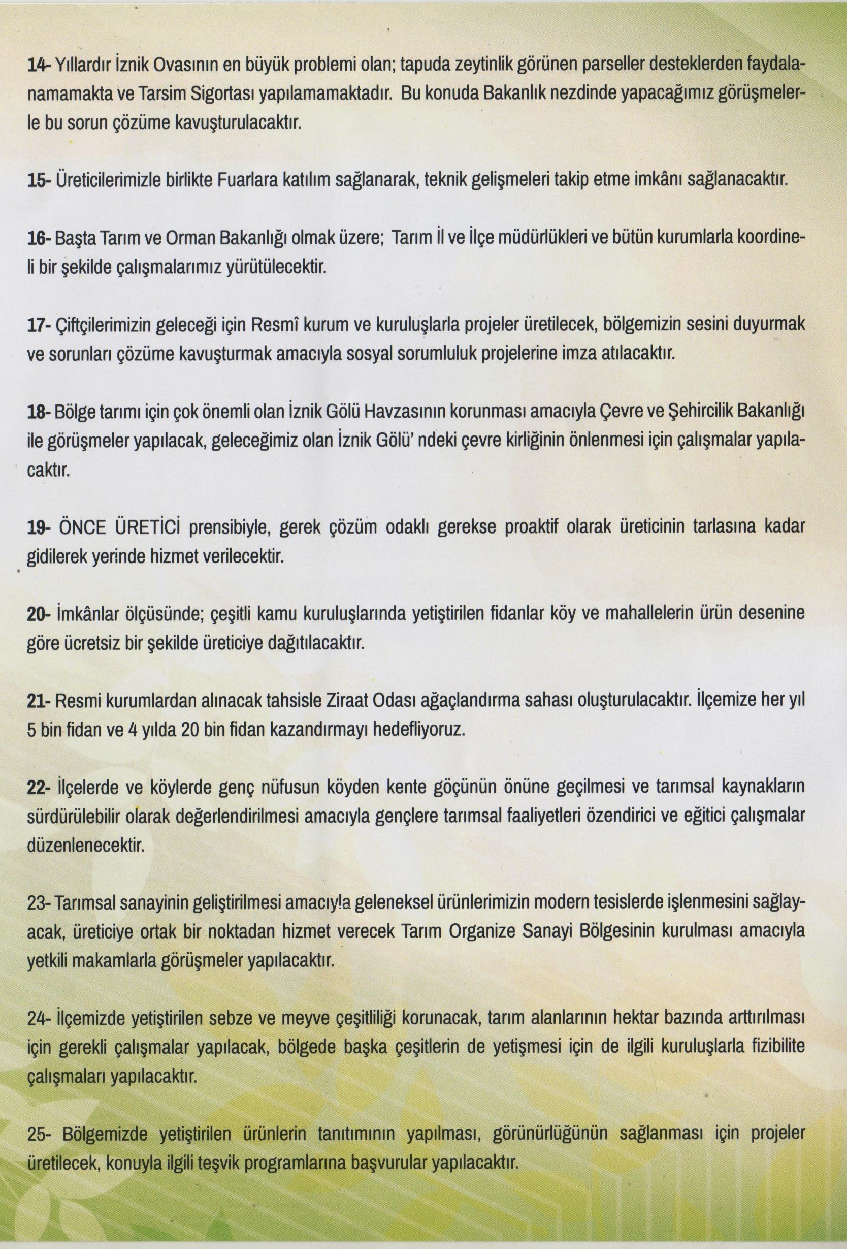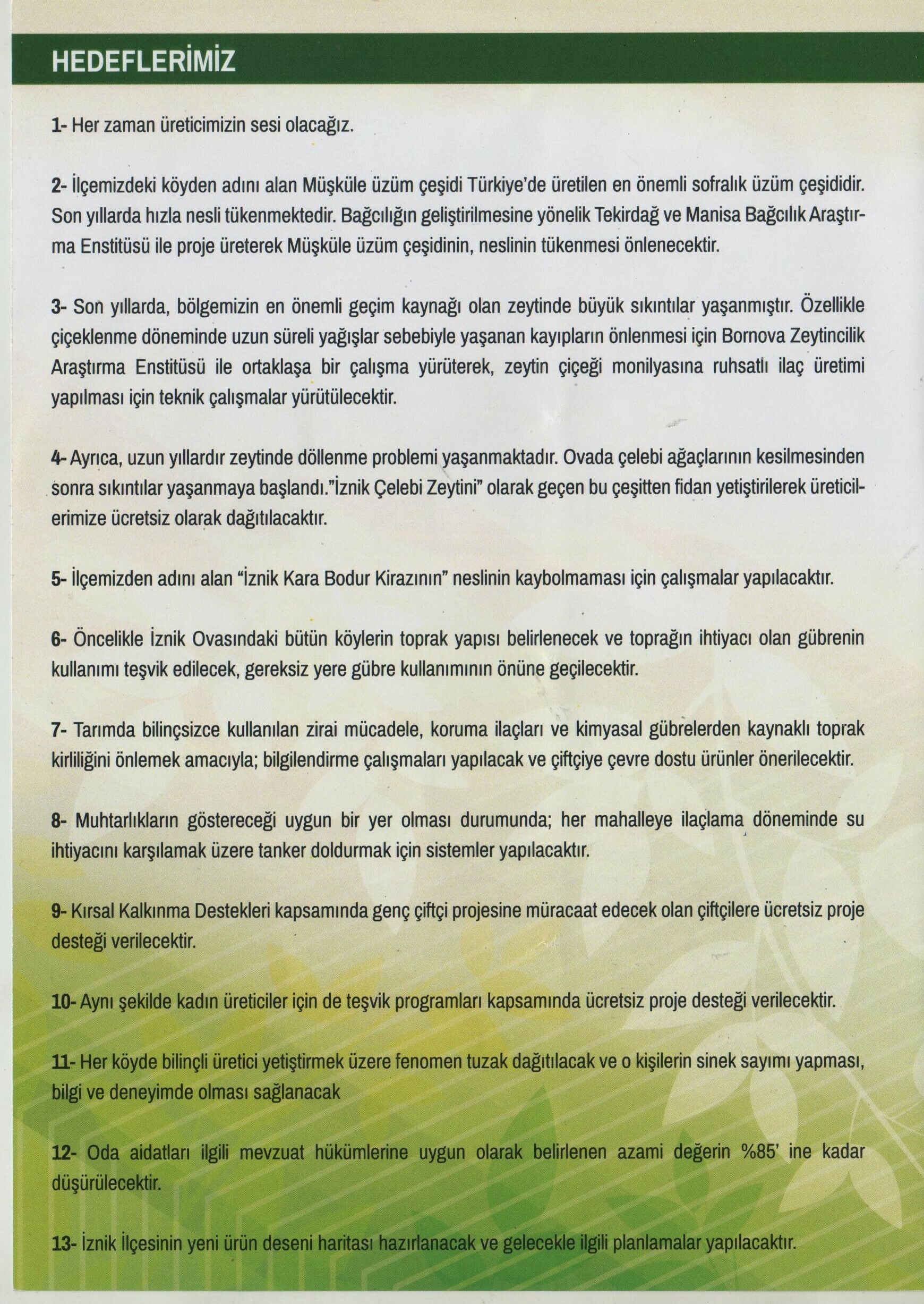 Yeni Dönemde, yeni yönetim anlayışıyla, sizlerle birlikte, İznik tarımının geleceğine yön vermeye talibiz. Geleneksel ve modern bakış açılarını birleştirerek, ben değil biz anlayışıyla gelecek nesillerimize daha verimli topraklar bırakmayı arzu etmekteyiz. Uzun yıllar kaybedilen zamanı, yapılacak çalışmalar ve üretilecek projelerle geri kazanmak istiyoruz. İznik tarımına değer katmak ve verimliliği arttırmak için öncü olmak istiyoruz” dedi.