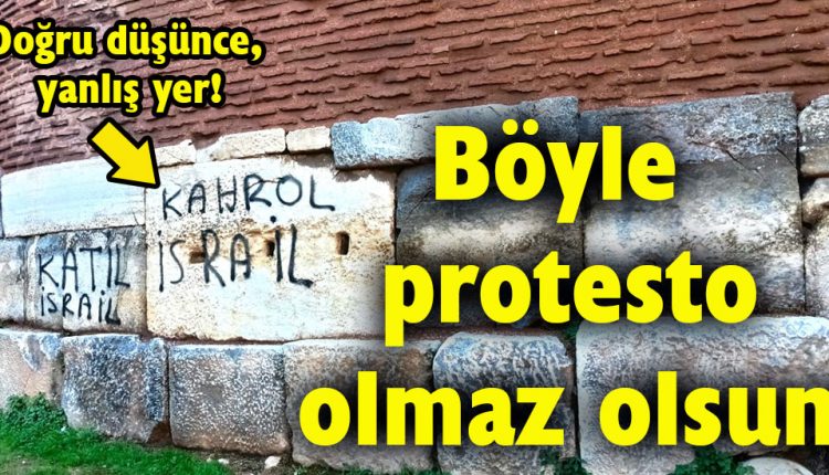 5 Medeniyete başkentlik yapmış tarihi ilçemizde 2 bin yıllık surlara sprey boya ile “Katil İsrail” yazdılar. Protesto edeceğiz derken surlara zarar verdiler. Esnaf ve vatandaşlar ise bu duruma tepki gösterdi. “Böyle protesto olmaz olsun. Düşünce doğru ama yer yanlış” dediler.