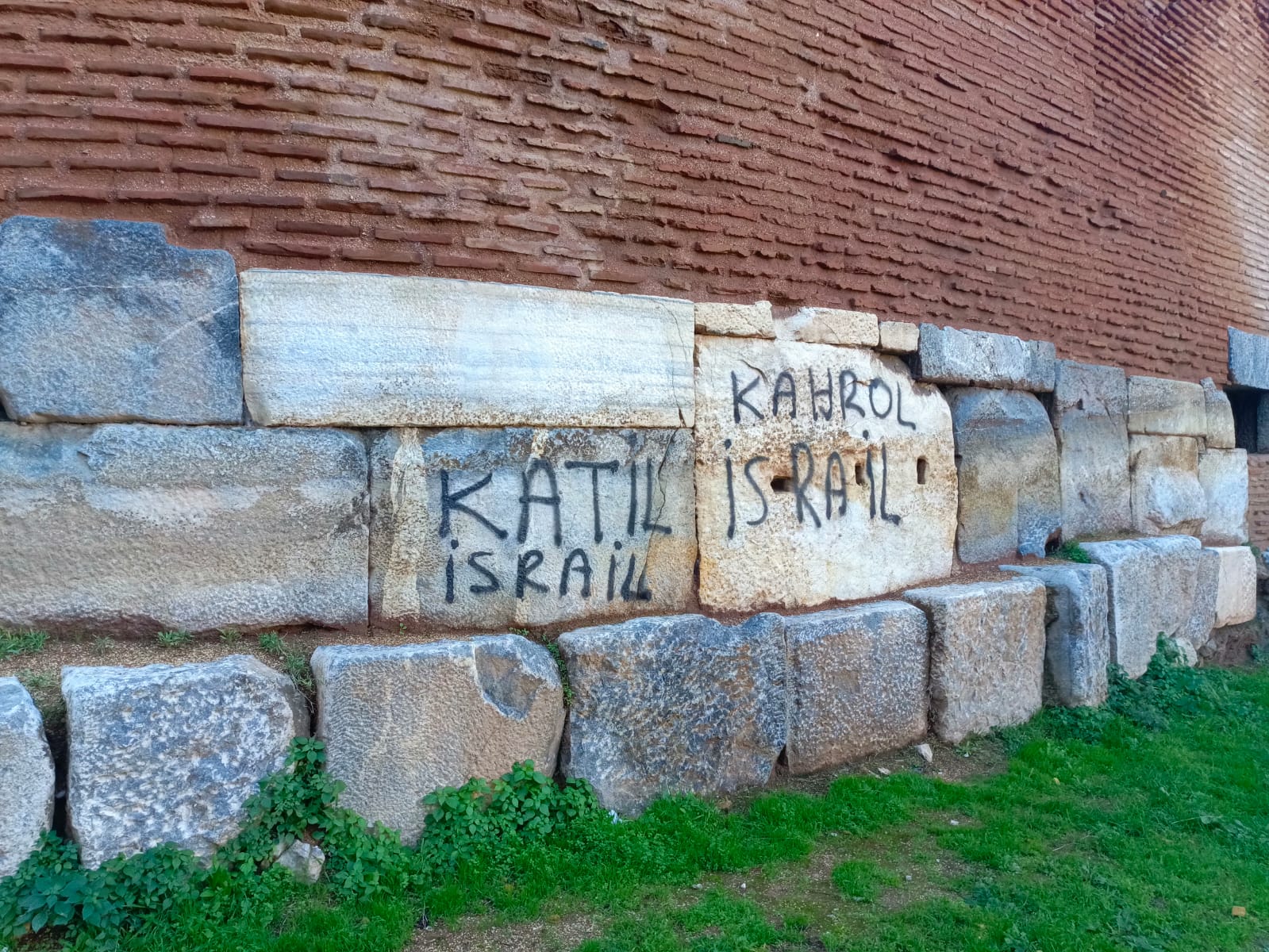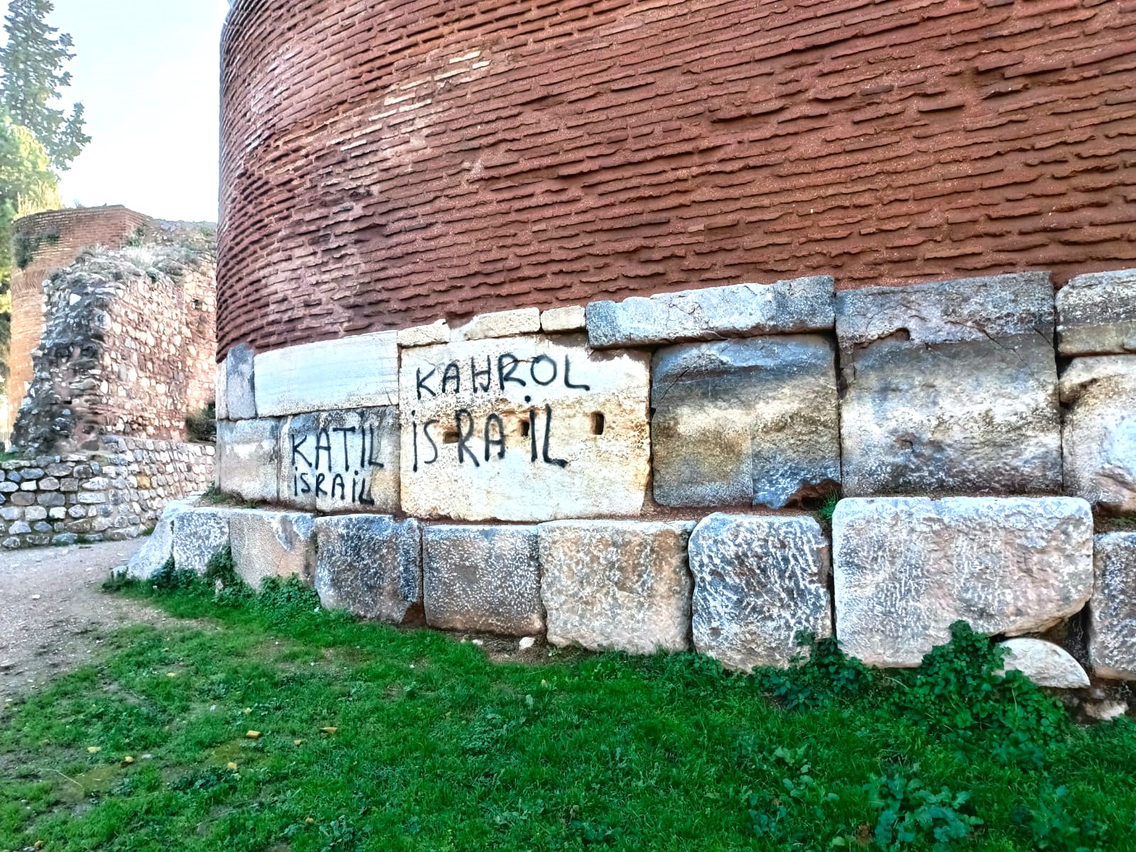 Vatandaşlar ise İsrail’i protesto etmek için kimliği belirsiz kişiler tarafından tarihi surlara yazılan bu yazılara tepki gösterdiler.