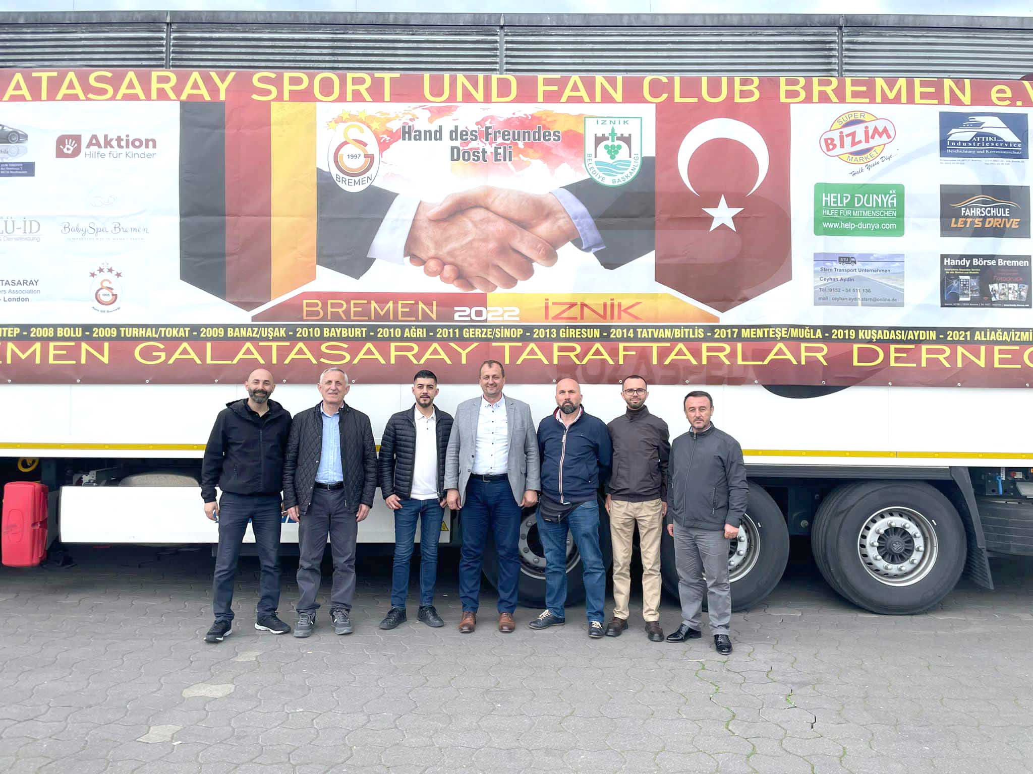 Bremen Galatasaray Taraftar Derneği’nin başlattığı “Dost Eli İznik 2022” Projesi kapsamında Belediye Başkanı Kağan Mehmet Usta, meclis Üyeleri Ramazan Sert ve Halil Arslan ile birlikte Almanya’ya gitti.  Yardım tırında tekerlekli sandalyeler, hasta yatakları, okul çantaları, ayakkabılar ve bir çok tıbbi malzemenin bulunduğunu belirten başkan Usta “yardım tırını hep birlikte yükledik. İçerisinde bulunan tüm malzemeleri ihtiyaç sahibi vatandaşlarımıza tek tek ulaştıracağız” dedi.