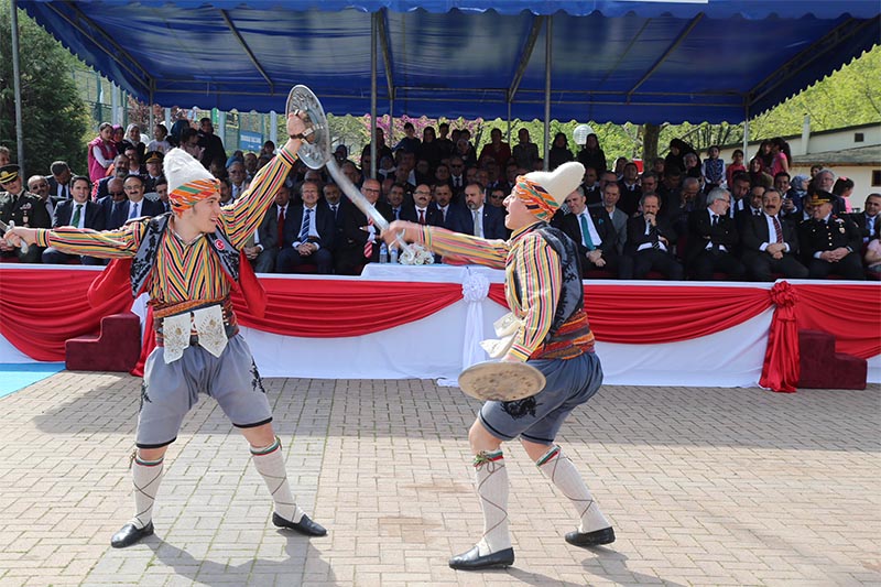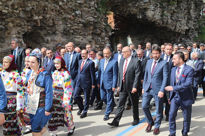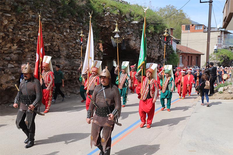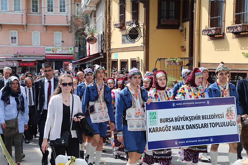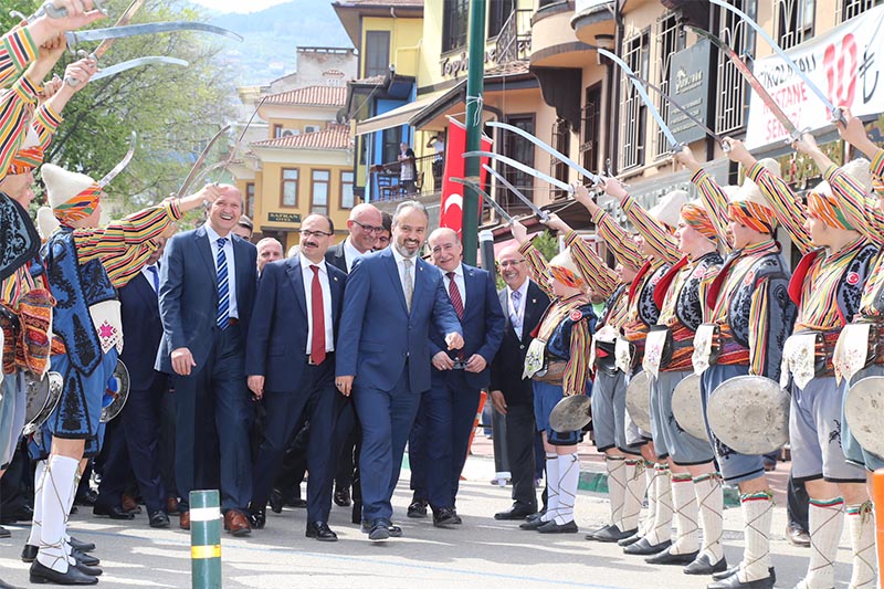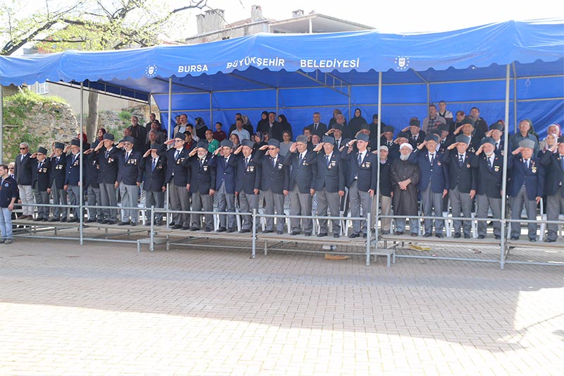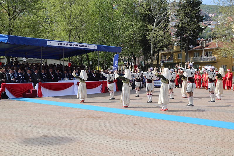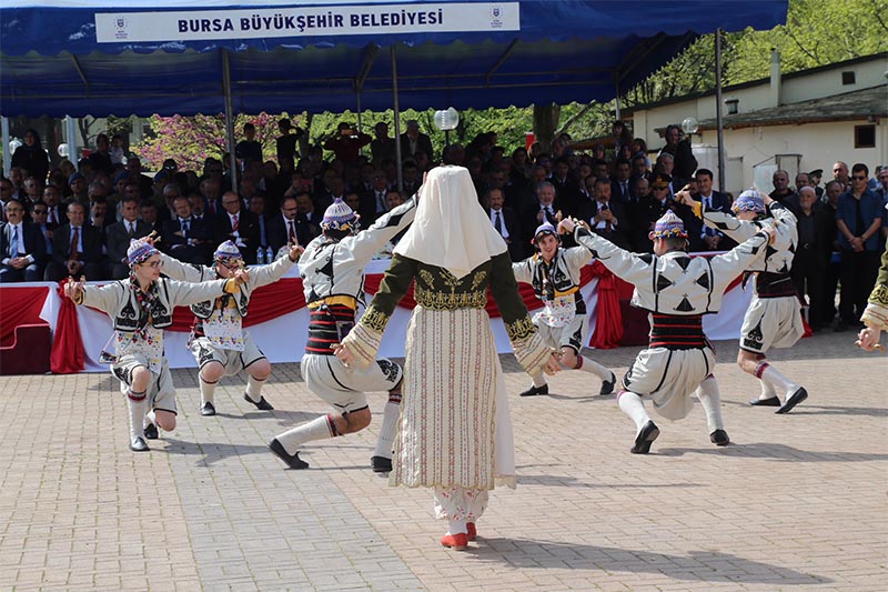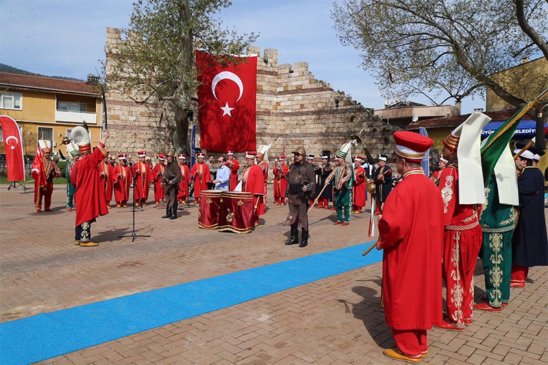 Protokol üyeleri, gaziler ve vatandaşlar, Mehter Takımı ve halk oyunları ekiplerinin eşliğinde Tophane’deki Osman Gazi ve Orhan Gazi türbelerine kadar yürüdü.