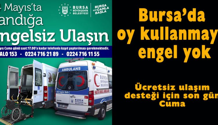 Bu arada engelsiz ulaşım hizmetinden yararlanmak isteyen vatandaşların, 12 Mayıs Cuma günü saat 17.00’a kadar Alo 153 ya da ‘0224 7161155’ ve 0224 7162189 numaralı telefonlardan kayıt yaptırması gerekiyor.