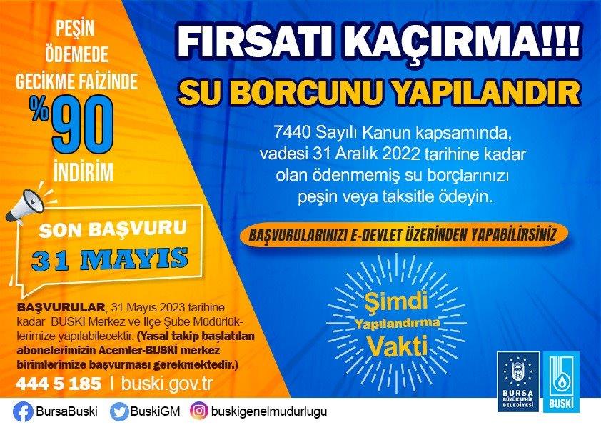 Resmi Gazete'de yayınlanan 7440 Sayılı Kanun ile vade tarihi 31 Aralık 2022 ve öncesine ait ödenmemiş borcu olan aboneler, yapılandırma fırsatından yararlanarak BUSKİ'ye ait borçlarını yapılandırabileceklerdir. Peşin ödemelerde gecikme faizinde yüzde 90’a varan indirim sağlayan kanun, ayrıca 48 aya kadar da eşit taksit imkanı sunuyor.