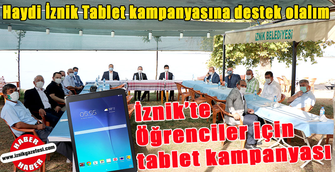 İznik Kaymakamlığı ve İznik Belediyesi öncülüğünde Milli Eğitim Müdürlüğü tarafından ihtiyaç sahibi öğrenciler için tablet kampanyası düzenlendi. Tertip edilen toplantıya Kaymakam Recai Karal, Belediye Başkanı Kağan Mehmet Usta, Milli Eğitim Müdürü Muhammet Asil, İTSO başkanı Mahmut Dede ile yönetim Kurulu üyeleri İsmet Kırık ve Hüseyin Yılmaz, Esnaf Odası Başkanı Kadir Akçaalan, Esnaf kefalet Başkanı Recep Uslu, Ziraat Odası Başkanı Vahit Mutlu, BATUM derneği başkanı Bekir Uslu, Serhat İlleri Başkanı Fazıl Olgun, İKEA başkanı Serhat Aydın, ADD adına Mehmet Akyüz, Karadenizliler Derneği başkanı Özcan Birinci ve ikinci başkan Nuri Namoğlu ile gazeteciler katıldı.