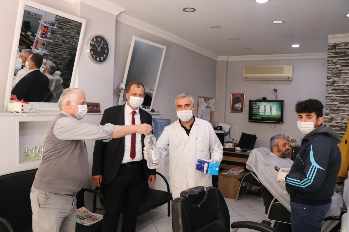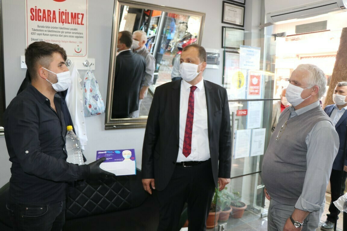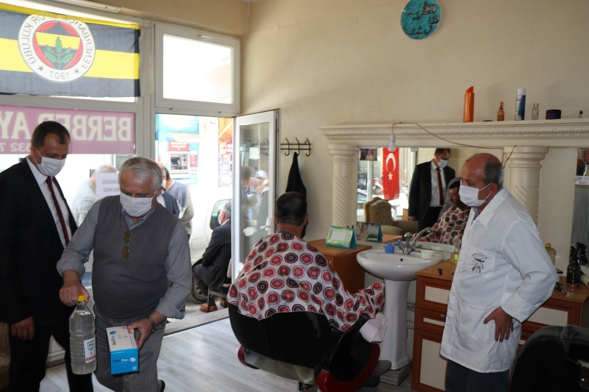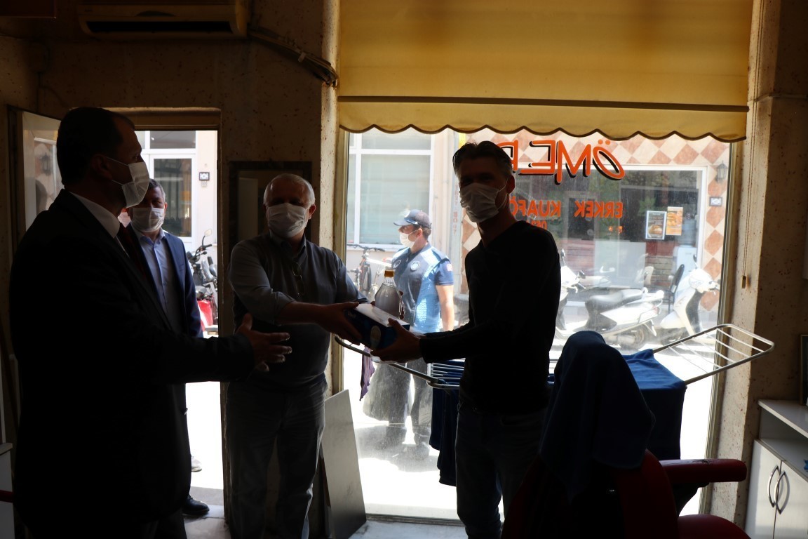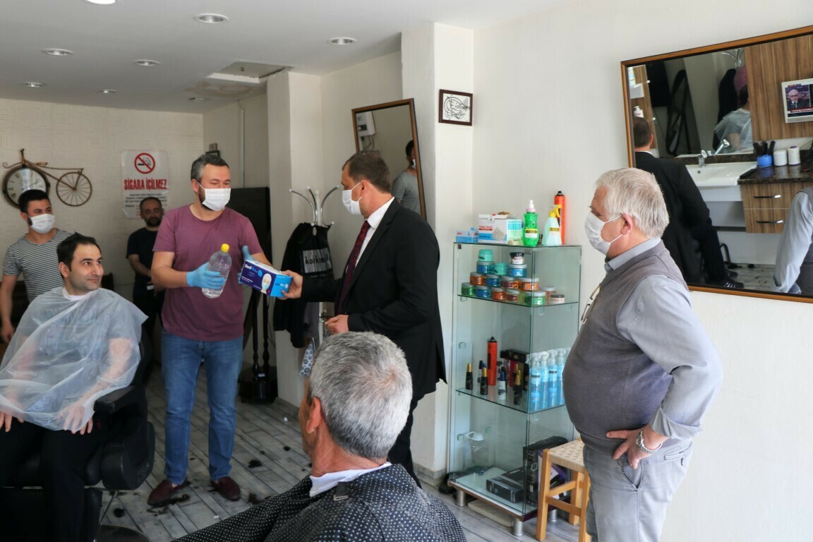 İznik Belediye Başkanı Kağan Mehmet Usta Esnaf Odası Başkanı Kadir Akçaalan ile birlikte hizmete başlayan berber ve kuaförlere maske ile el dezenfektanı dağıttı.