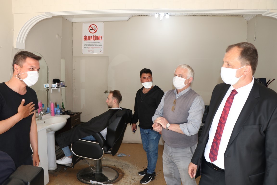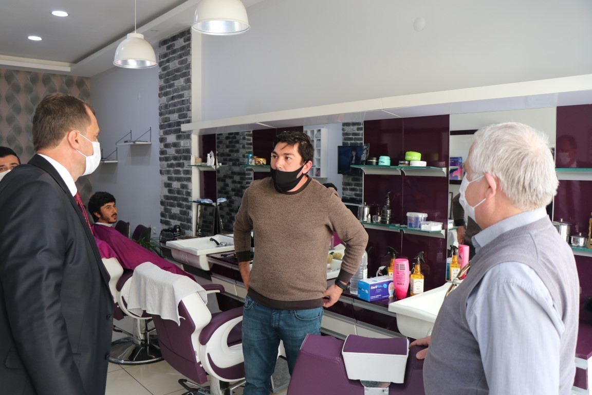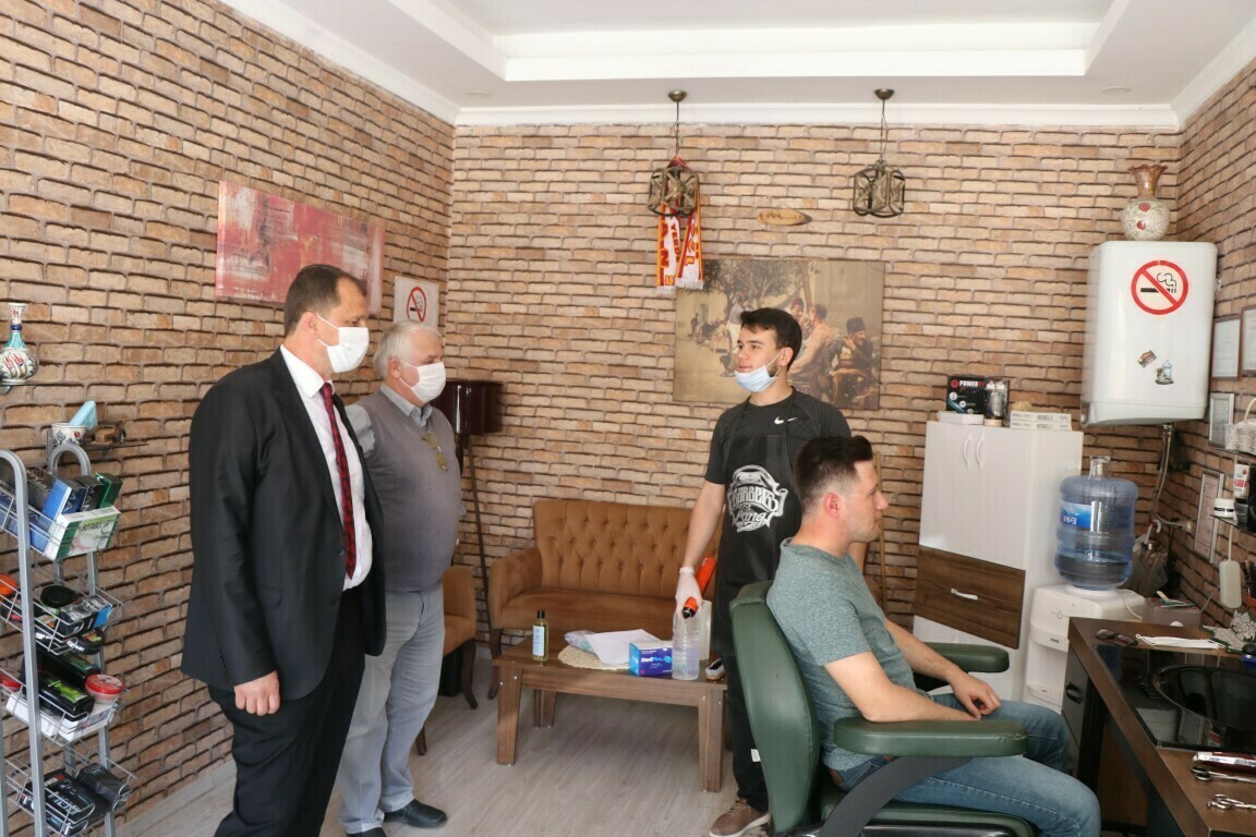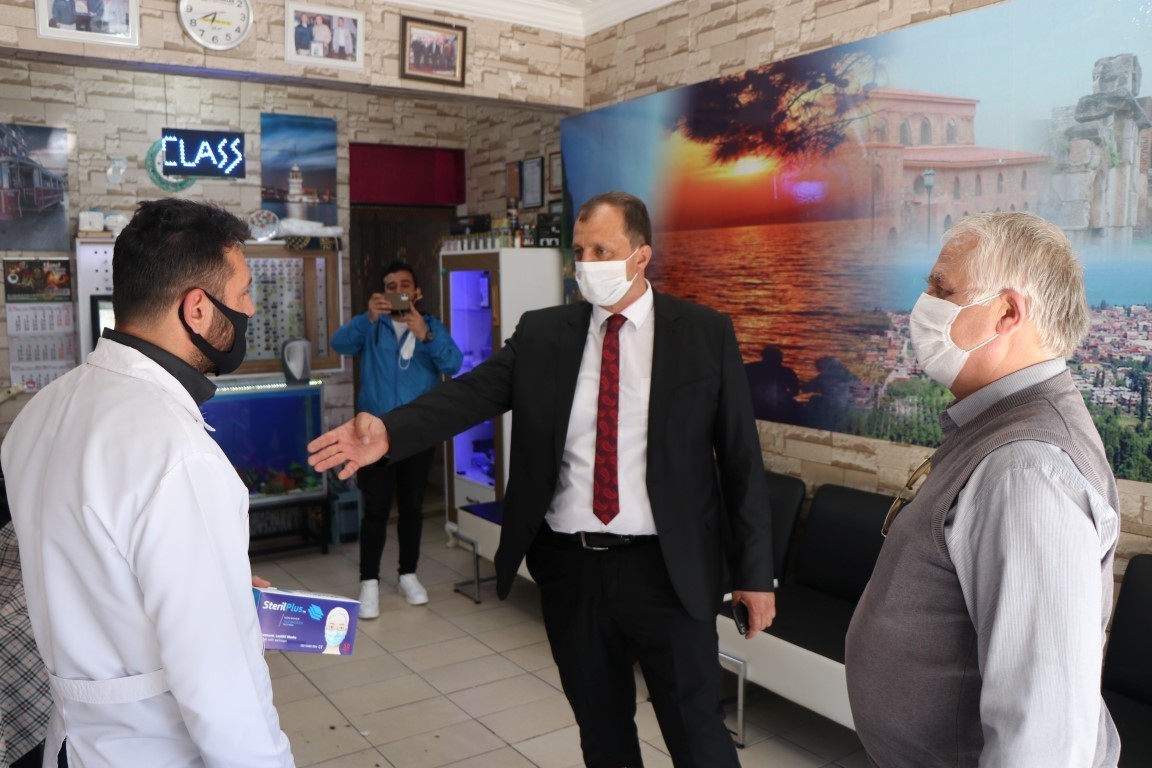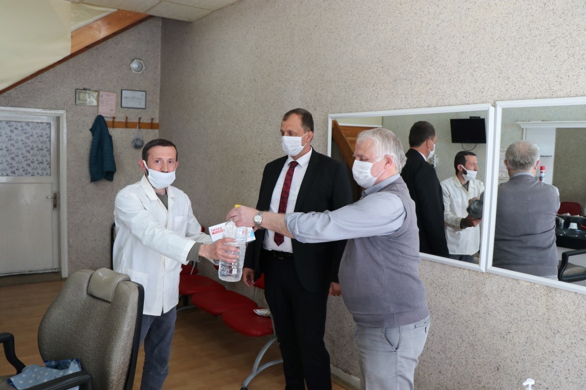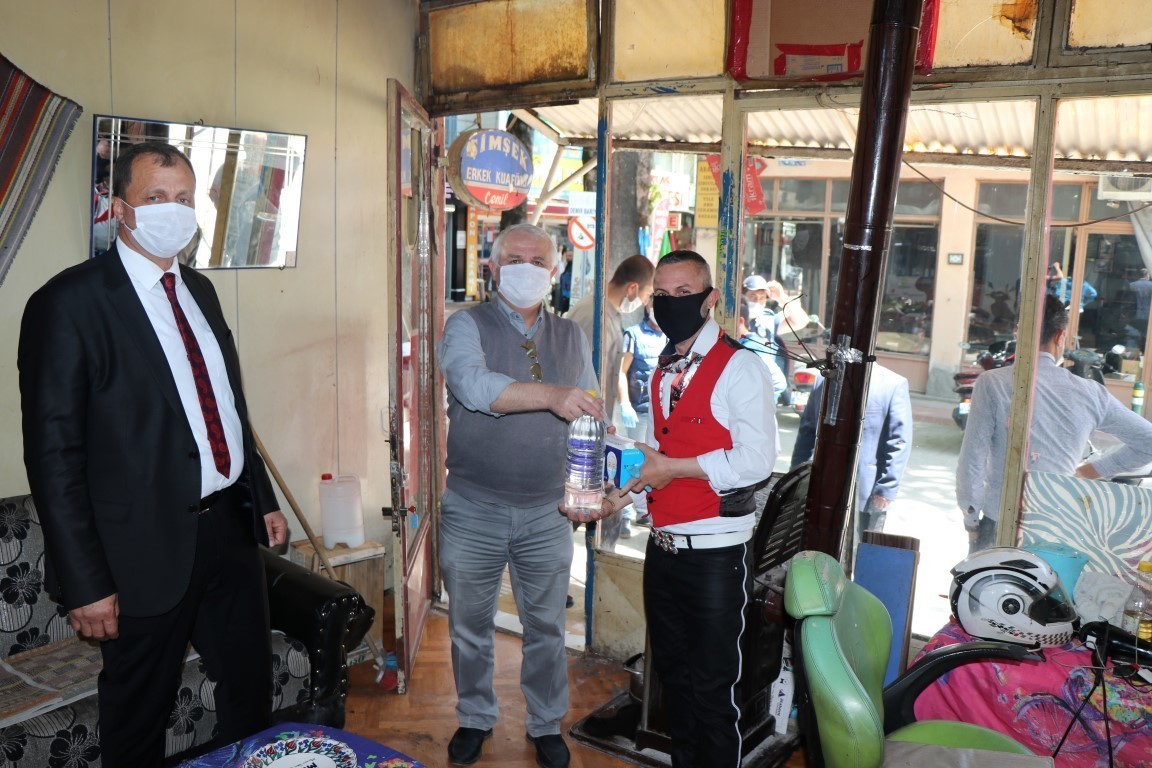 İznik Belediye Başkanı Kağan Mehmet Usta Esnaf Odası Başkanı Kadir Akçaalan ile birlikte hizmete başlayan berber ve kuaförlere maske ile el dezenfektanı dağıttı.