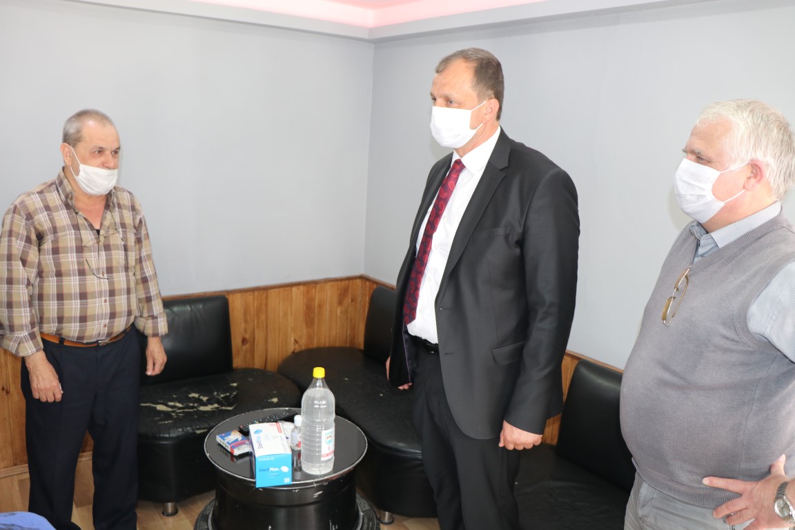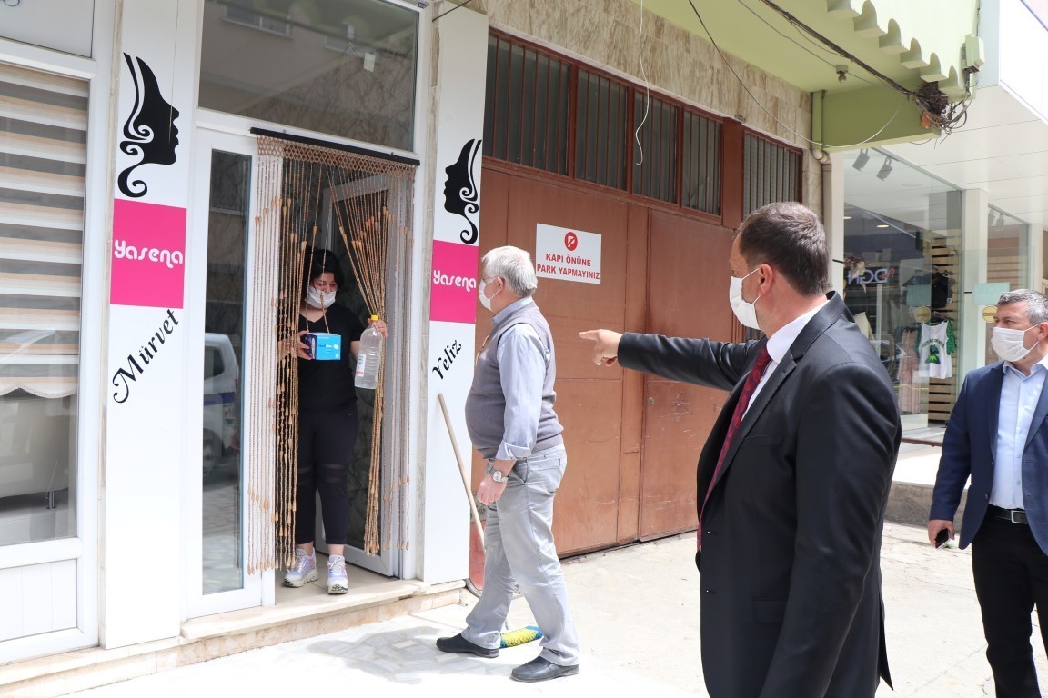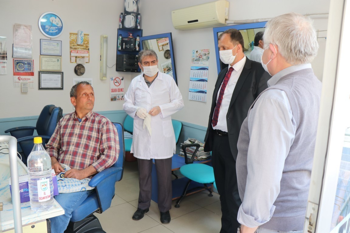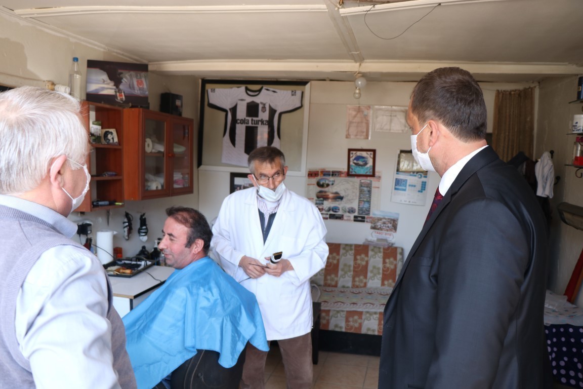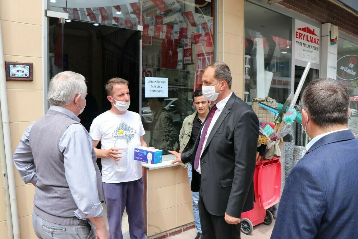 İznik Belediye Başkanı Kağan Mehmet Usta Esnaf Odası Başkanı Kadir Akçaalan ile birlikte hizmete başlayan berber ve kuaförlere maske ile el dezenfektanı dağıttı.