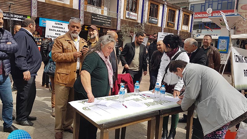 Vatandaşların, döviz ve pankart açtığı imza kampanyasında konuşan ADD İznik Şubesi Başkanı Ergün Balaban, “İznik tarihi, çinisi ve gölü ile meşhurdur. Ancak henüz onlar kadar bilinmeyen ama en az onlar kadar önemli ve değerli bir varlığı daha bulunmaktadır ki, o da hemen kuzeyimizde yükselen samanlı dağlarıdır. Gemlik armutlu yarımadasından, Adapazar’ı, Sapanca’ya kadar uzanan bu silsilenin diğer pek çok yeri gibi, İznik sınırlarında kalan bölümü de yoğun ormanlarla kaplıdır ve hala canlı bir yaban hayatını barındırmaktadır. Bu kayın ve gürgen ağırlıklı ormanlarda Karadeniz bölgesine özgü yabani orman gülü ve karayemiş de dahil olmak üzere pek çok bitki; koruma altındaki ayı ve kurt gibi büyük memelilerle kırmızı benekli alabalıklar da dahil pek çok hayvan barınmaktadır. İznik’in yoğun oksijen ve su üreten kayın ormanları, yalnızca üzerinde yaşayan insanlarımız ve hayvanlar için değil; İznik için, Bursa için, Marmara bölgesi ve Türkiye için, yani hepimiz için çok değerlidir.