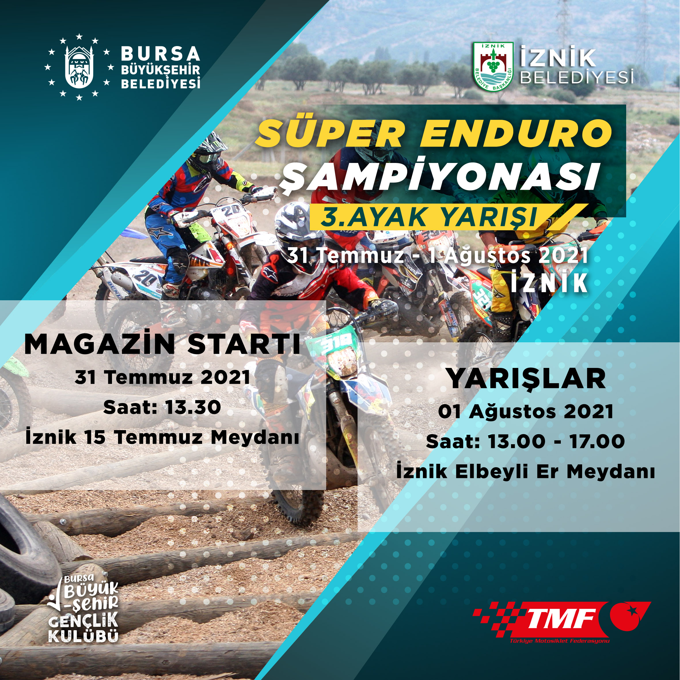 Bursa Büyükşehir Belediyesi koordinasyonunda, İznik Belediyesi, Türkiye Motosiklet Federasyonu, Gençlik ve Spor Hizmetleri Dairesi Başkanlığının katkılarıyla düzenlenen Türkiye Süper Enduro Şampiyonası’nın üçüncü ayak yarışı, 31 Temmuz-1 Ağustos tarihlerinde İznik Elbeyli Er Meydanı’nda yapılacak.