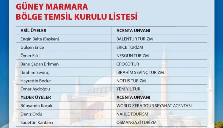 Engin Balta (Balen Turizm) başkanlığındaki yeni yönetime; Gülşen Erice (Erice Turizm), Ömer Eski (Nesgün Turizm), Banu Şadan Erkmen (Croco Tur), İbrahim Sevinç (İbrahim Sevinç Turizm), Hayrettin Bodur (Notus Turizm) ve Ömer Aydoğdu (Yeni Yıl Tur) seçildi.