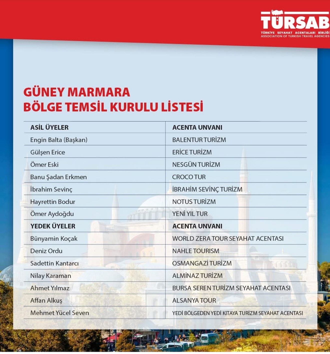 TÜRSAB Yönetim Kurulu, 30 Ağustos 2022 tarihinde aldığı olağan karar doğrultusunda, Güney Marmara Bölge Temsil Kurulu seçime gitti. Gerçekleşen seçimde mavi listeden aday olan Engin Balta TÜRSAB’ın yeni başkanı olarak seçildi.