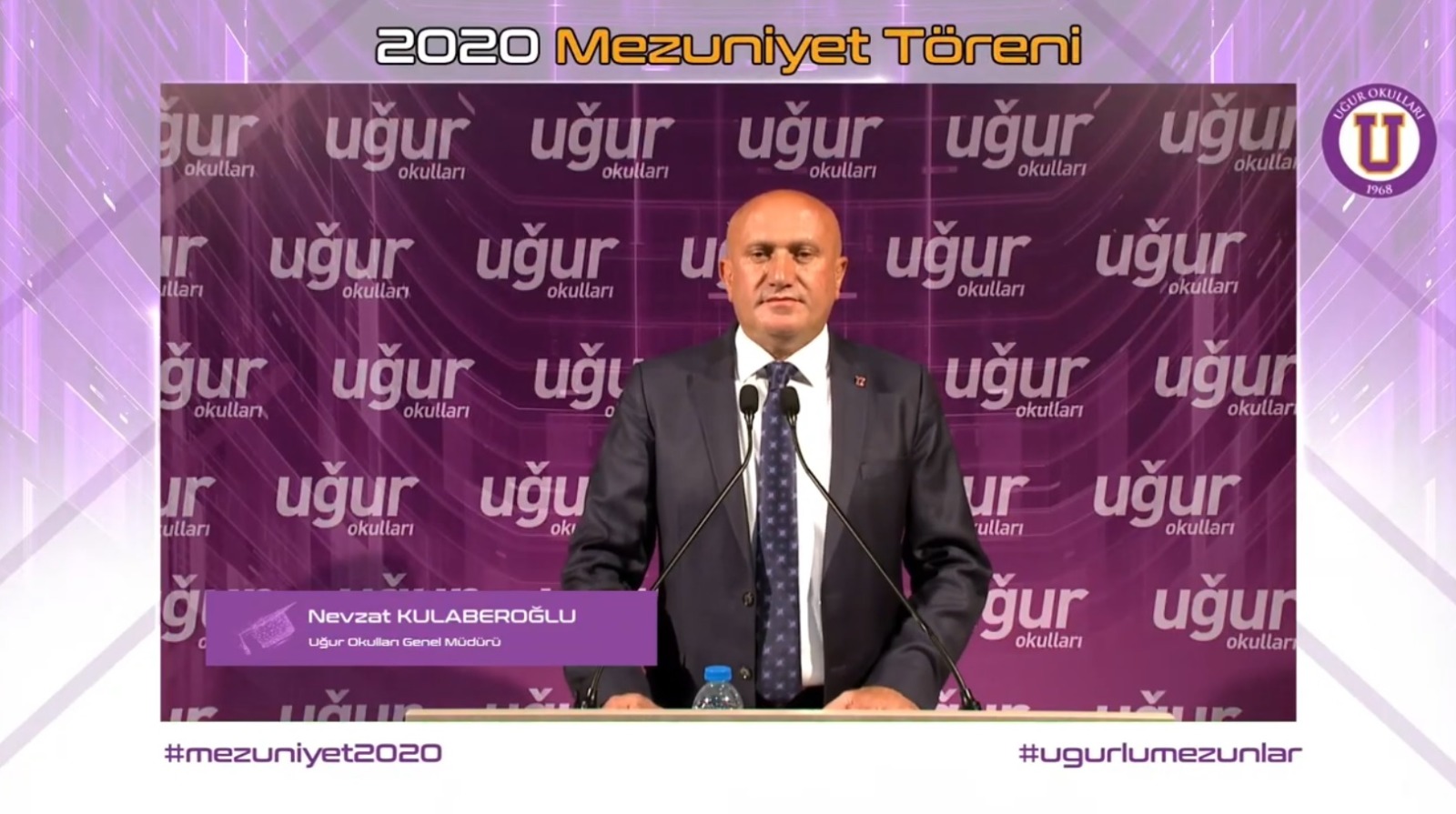 Uğur Okulları Genel Müdürü Nevzat KULABEROĞLU ise Türkiye genelinde binlerce Uğurlu öğrencinin mezun olduğunu dile getirerek: “Bu yıl pandemi nedeni ile hep birlikte çok farklı tecrübeler ediniyoruz. Mezuniyet törenimiz de aynı nedenlerle her zamankinden farklı. Sevgili öğrencilerimizin, arkadaşları ile şu an aynı mekanda olamasalar da ekran başında tek bir yürek olarak geleceğe adım atmanın heyecanını duyduğumuza kuşkum yok.” dedi. Öğrencilerin dijital ortamda keplerini havaya fırlatması ile tören sona erdi.