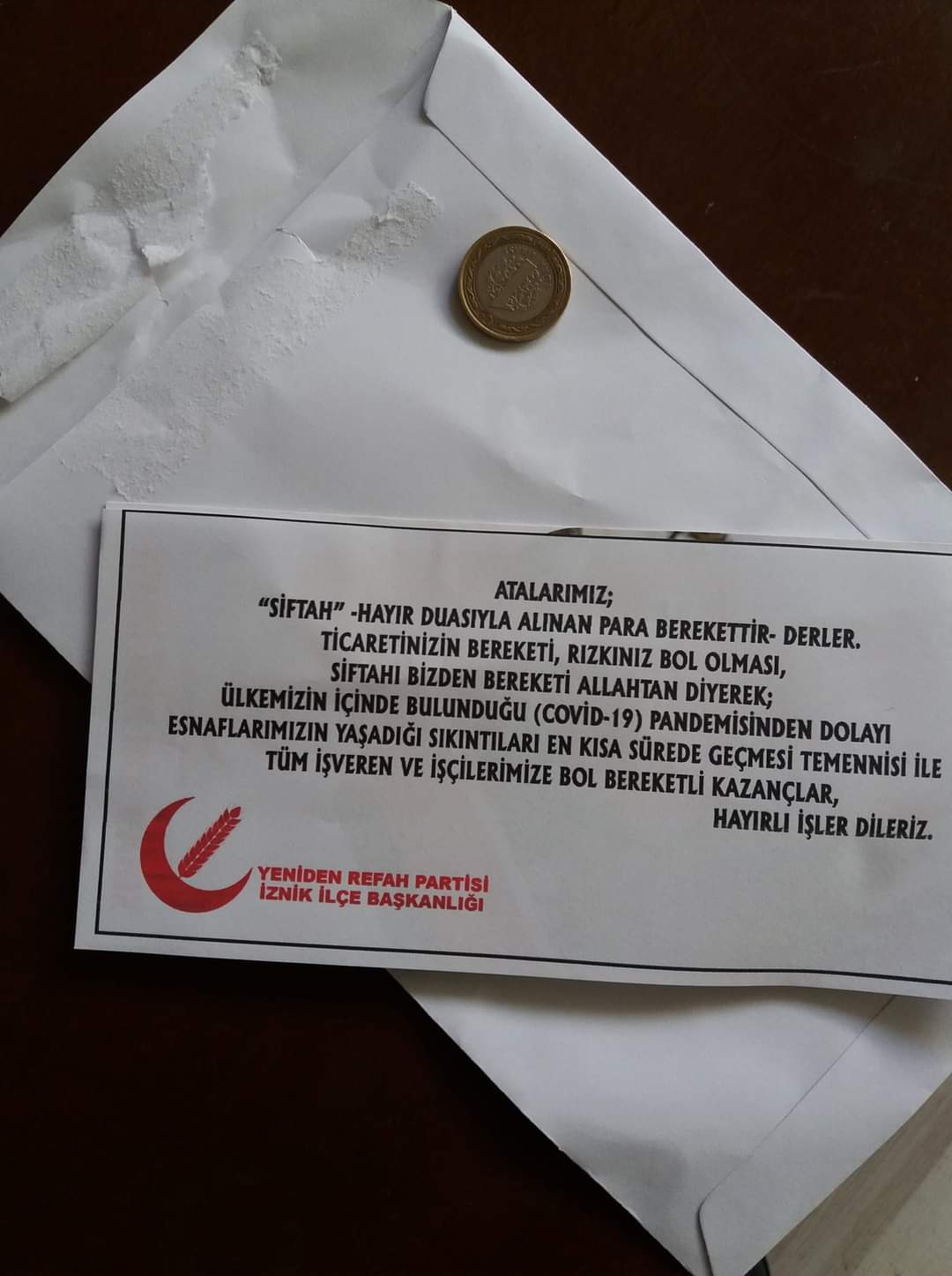 Yeniden Refah Partisi İlçe Başkanı Mustafa Panzehir ve Yönetimi İznik’te farklı bir uygulama gerçekleştirdi. Parti üyeleri ilçede ticaret yapan esnafa içinde mektup ve para bulunan zarflar bıraktı. İlçe merkezinde yaklaşık 1500 esnafa dağıtılan mektupta siftahın önemine değinildi. Esnafa dağıtılan mektupta; Atalarımız “Siftah” hayır duasıyla alınan para berekettir derler. Ticaretinizin bereketi, rızkınızın bol olması, siftahı bizden bereketi Allahtan diyerek; Ülkemizin içinde bulunduğu (Covit-19) Pandemiden dolayı esnaflarımızın yaşadığı sıkıntıları en kısa sürede geçmesi temennisi ile tüm işveren ve işçilerimize bol bereketli kazançlar, hayırlı işler dileriz” ifadelerine yer verildi.