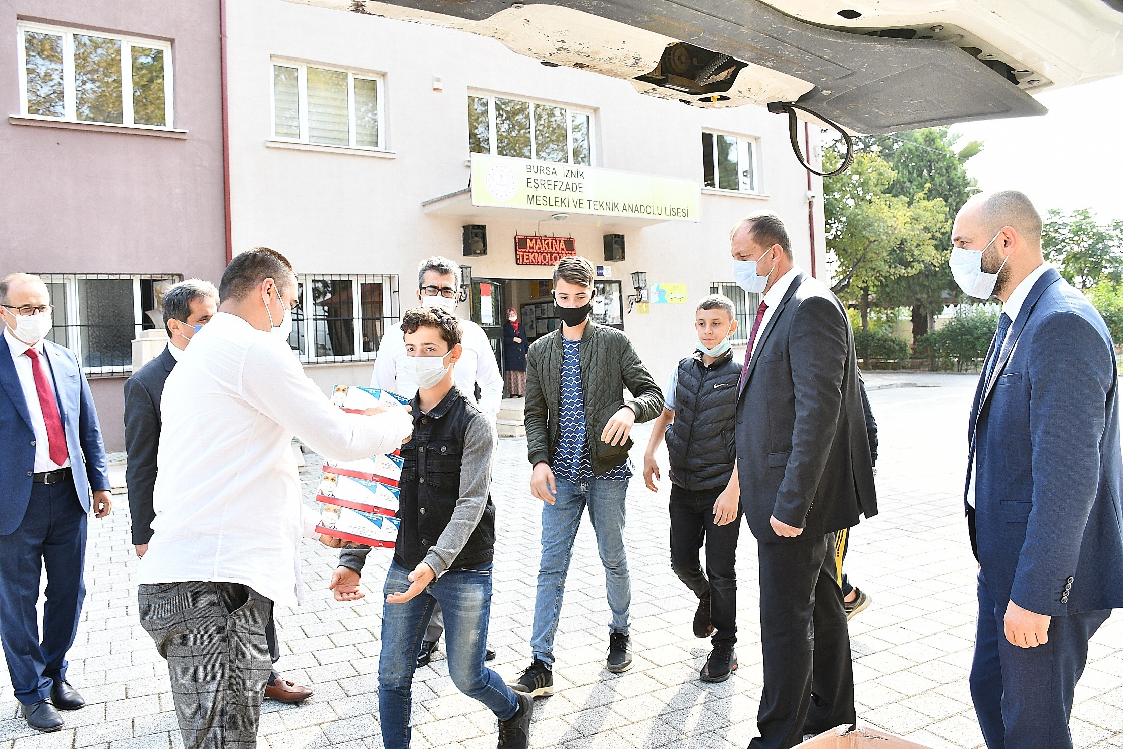 İznik Belediye Başkanı Kağan Mehmet Usta ve İlçe Milli Eğitim Müdürü Muhammed Asil ilçede ki tüm liselere tek tek gezerek maskeleri teslim ettiler. Başkan Kağan Mehmet Usta “Yüz yüze eğitimde bugün yeni bir süreç başladı. Bizlerde bu zor süreçte ilk günden itibaren eğitime, okullarımıza ve öğrenci ve öğretmenlerimize desteğimizi aralıksız sürdürüyoruz. Bugün de toplamda 35 bin maske ile hijyen setini ilkokul ve liselerimize teslim ediyoruz. Rabbim bu pandemi sürecini bir an önce hayırlısıyla bitirmeyi nasip eylesin” dedi.